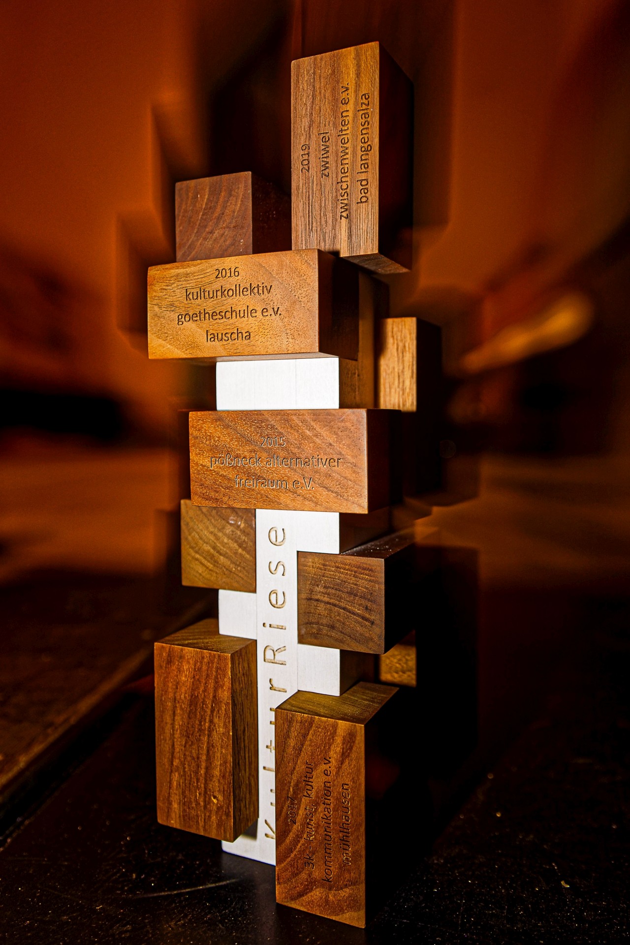 Also baten wir den Erfurter Künstler Michal Schmidt um einen Entwurf. Und er hatte die geniale Idee: ein wachsender Kulturriese! An ein hochformatiges Grundsegment kann jedes Jahr ein Element für den neuen Preisträger hinzugefügt werden, sodass sich die Skulptur beständig erweitert. Und das Beste war das Material: Holz. Die Fertigung übernahm der Architekturmodellbauer Lars Bucki.